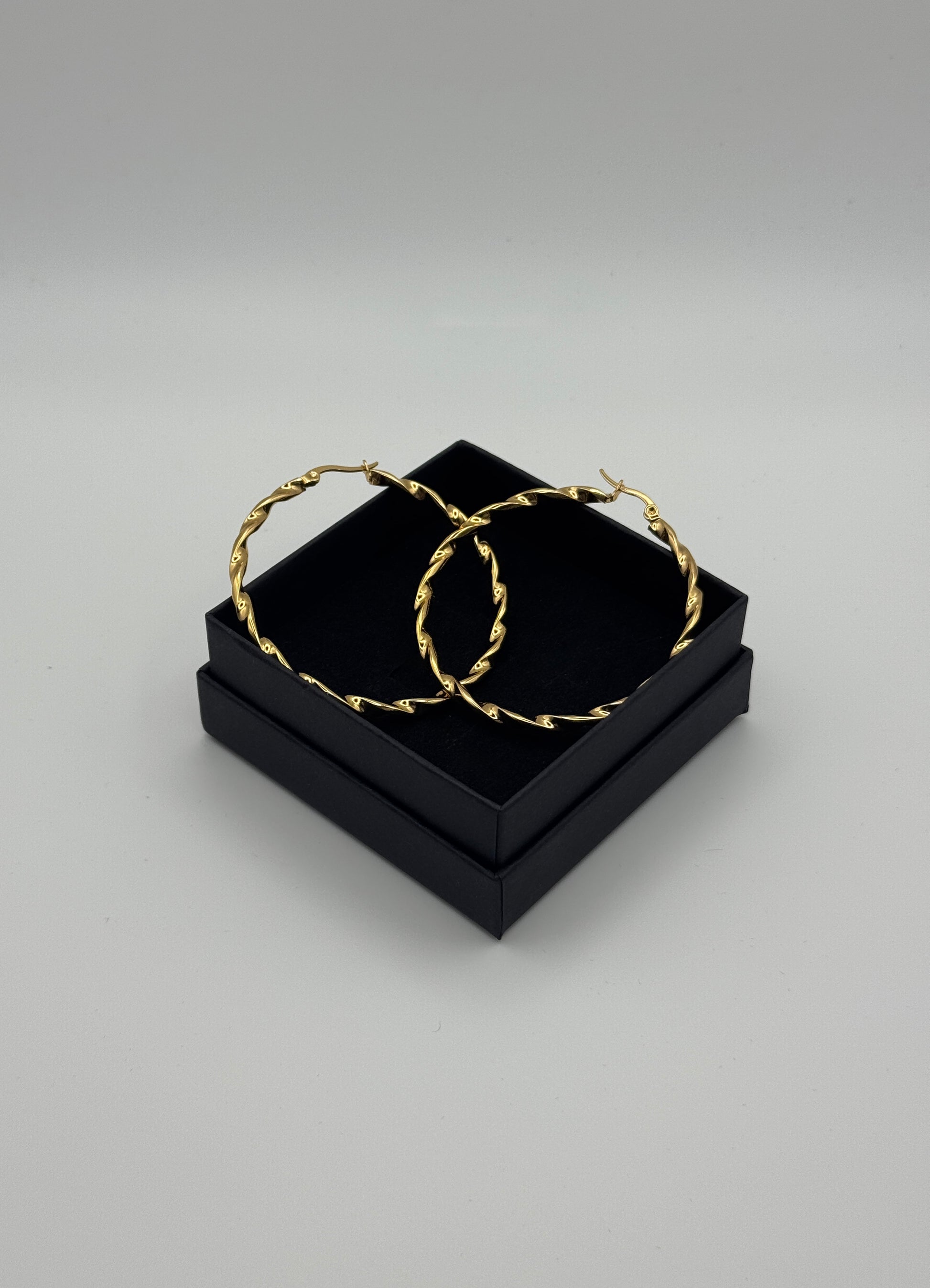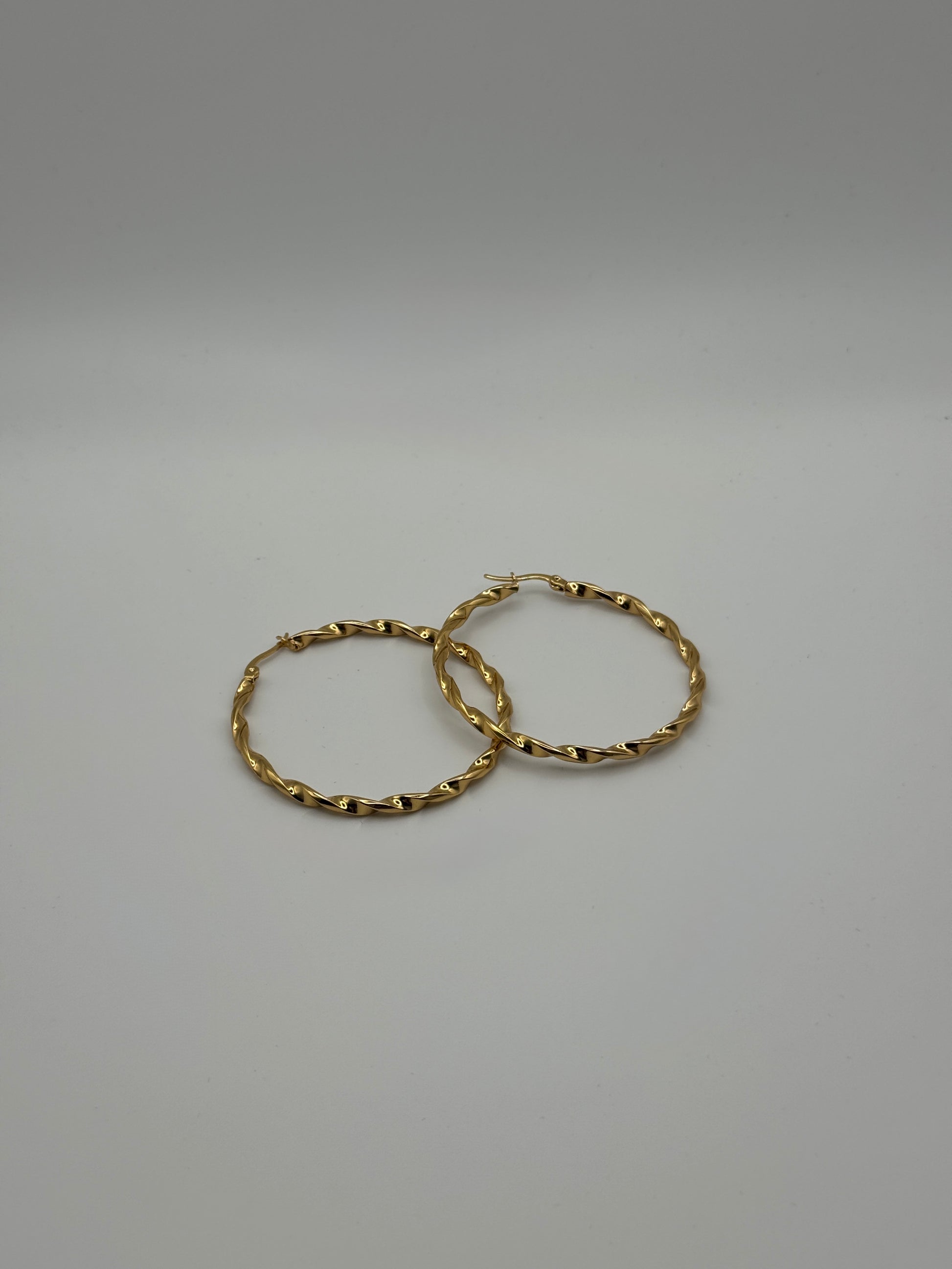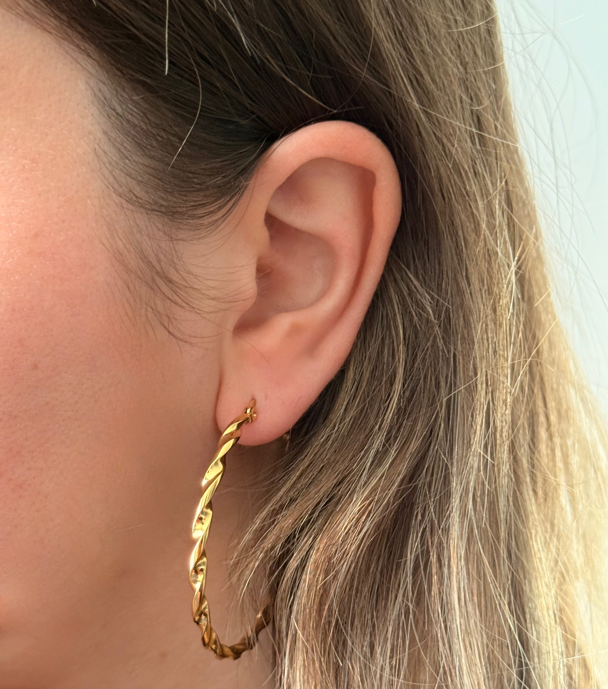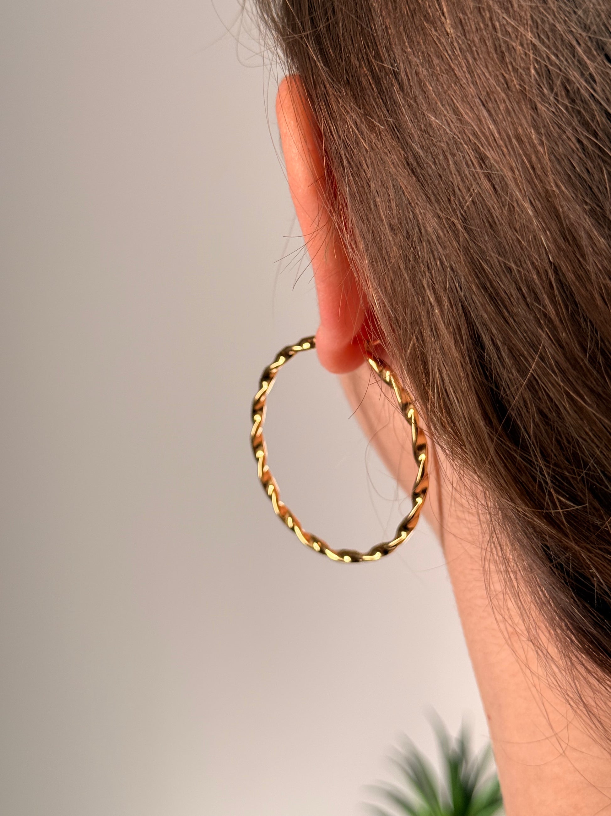 Son design créoles torsadées au design épuré et lumineux. Leur finition en acier inoxydable plaqué or offre une brillance chaude et sophistiquée tout en garantissant une excellente résistance au quotidien.