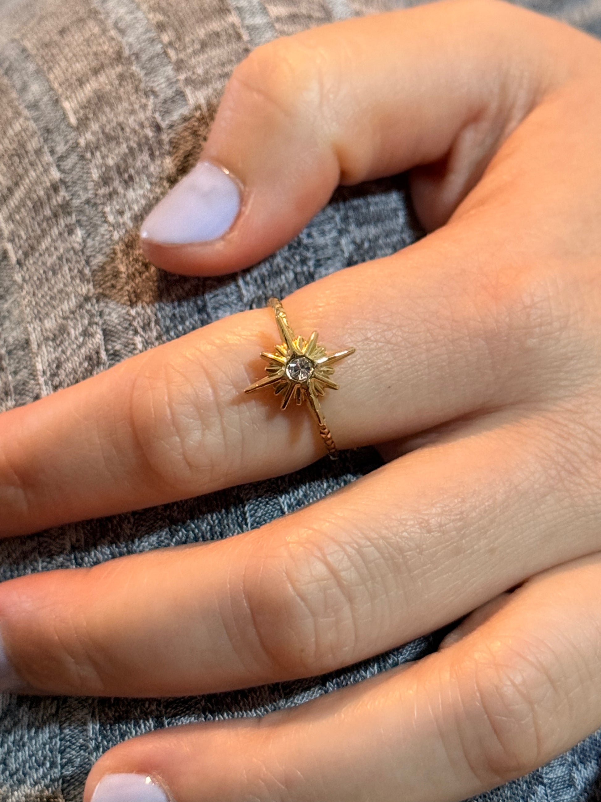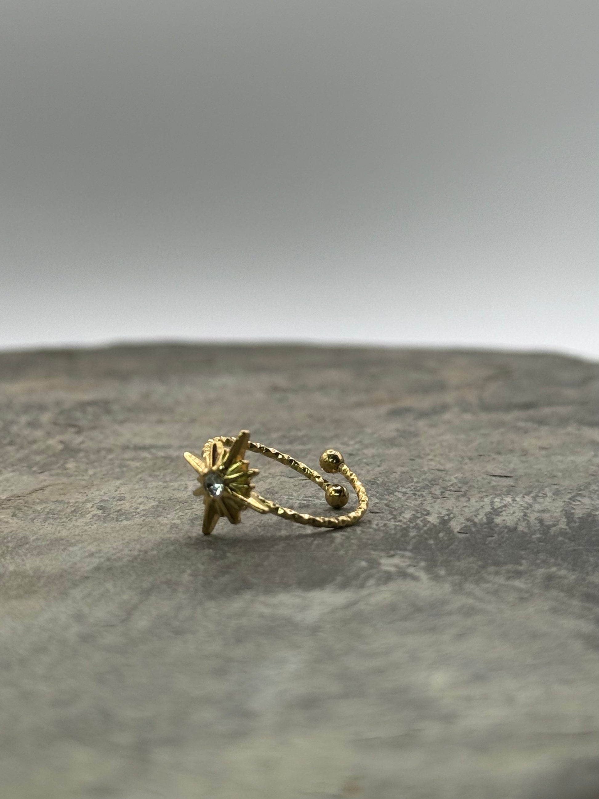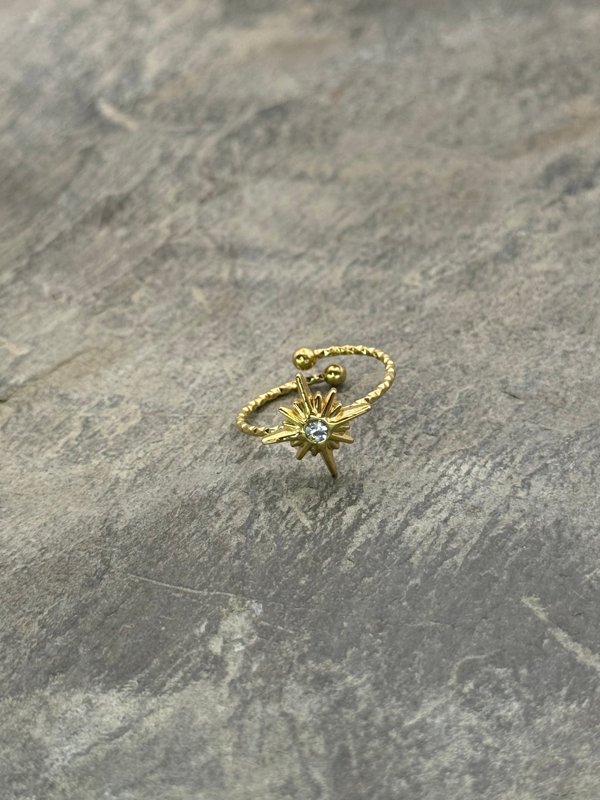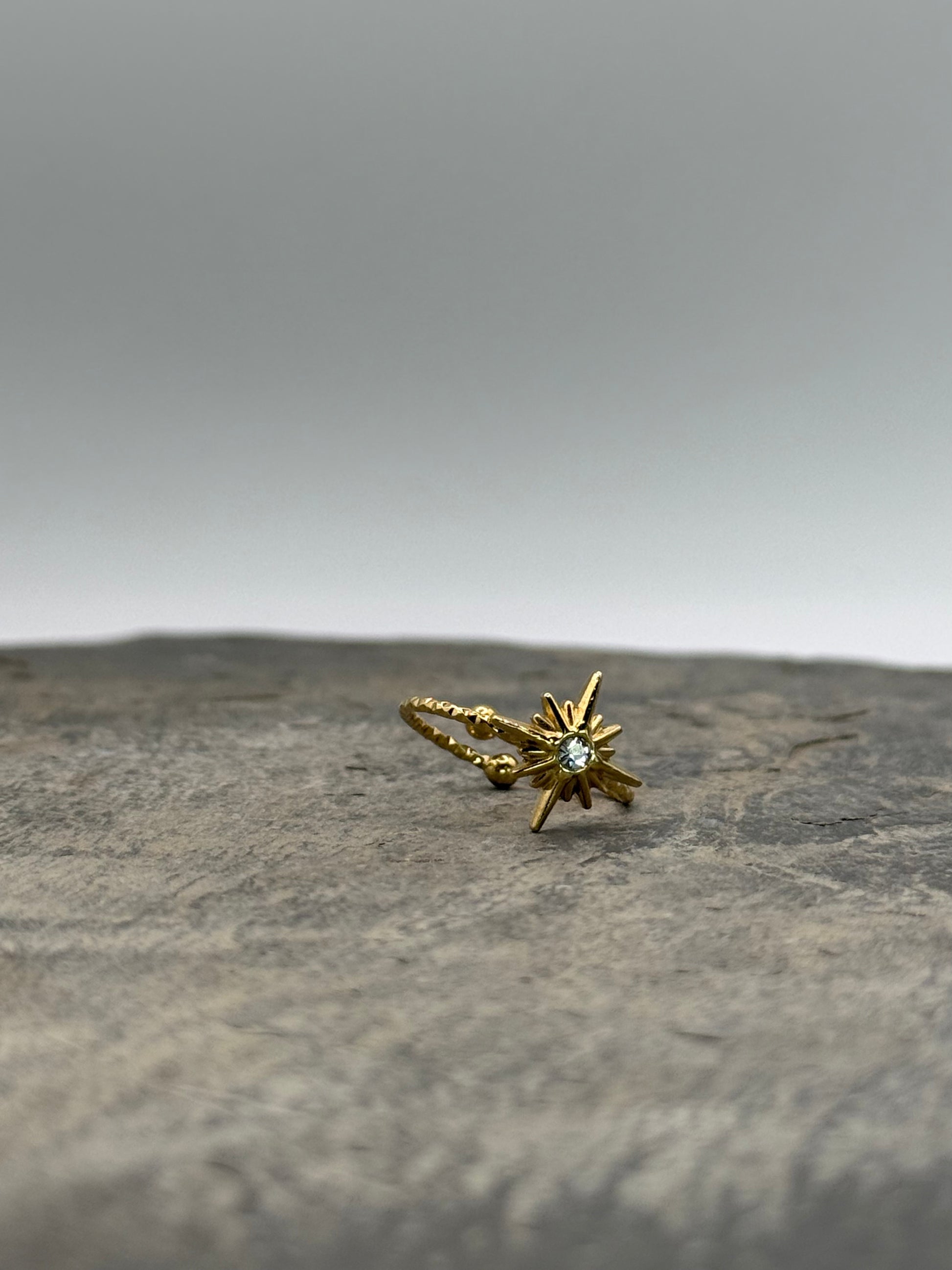 Découvrez la bague Eclat cosmique, conçue en acier plaqué or et ornée d’un diamant délicatement serti d’une étoile, rappelant un éclat venu de l’univers.