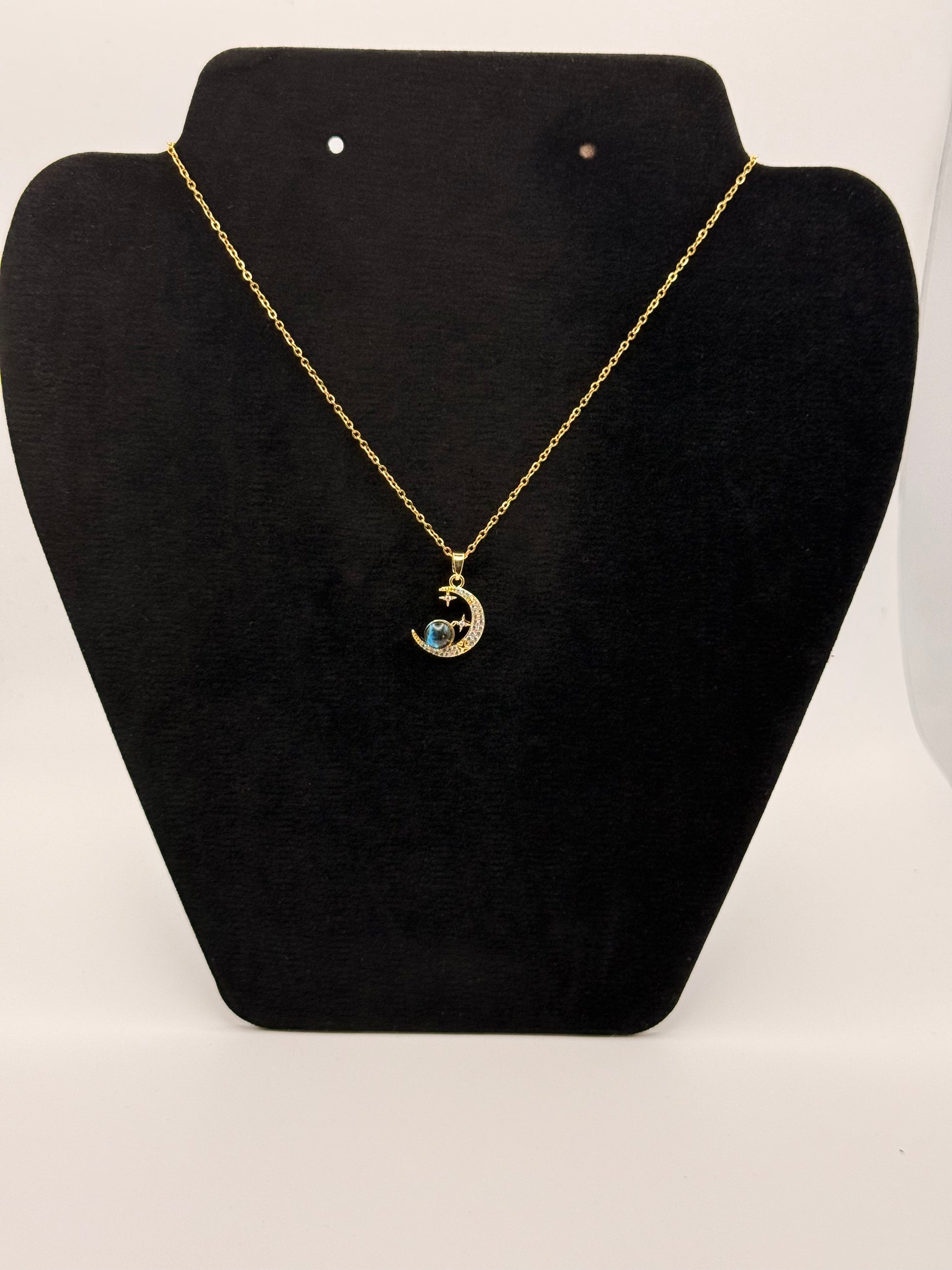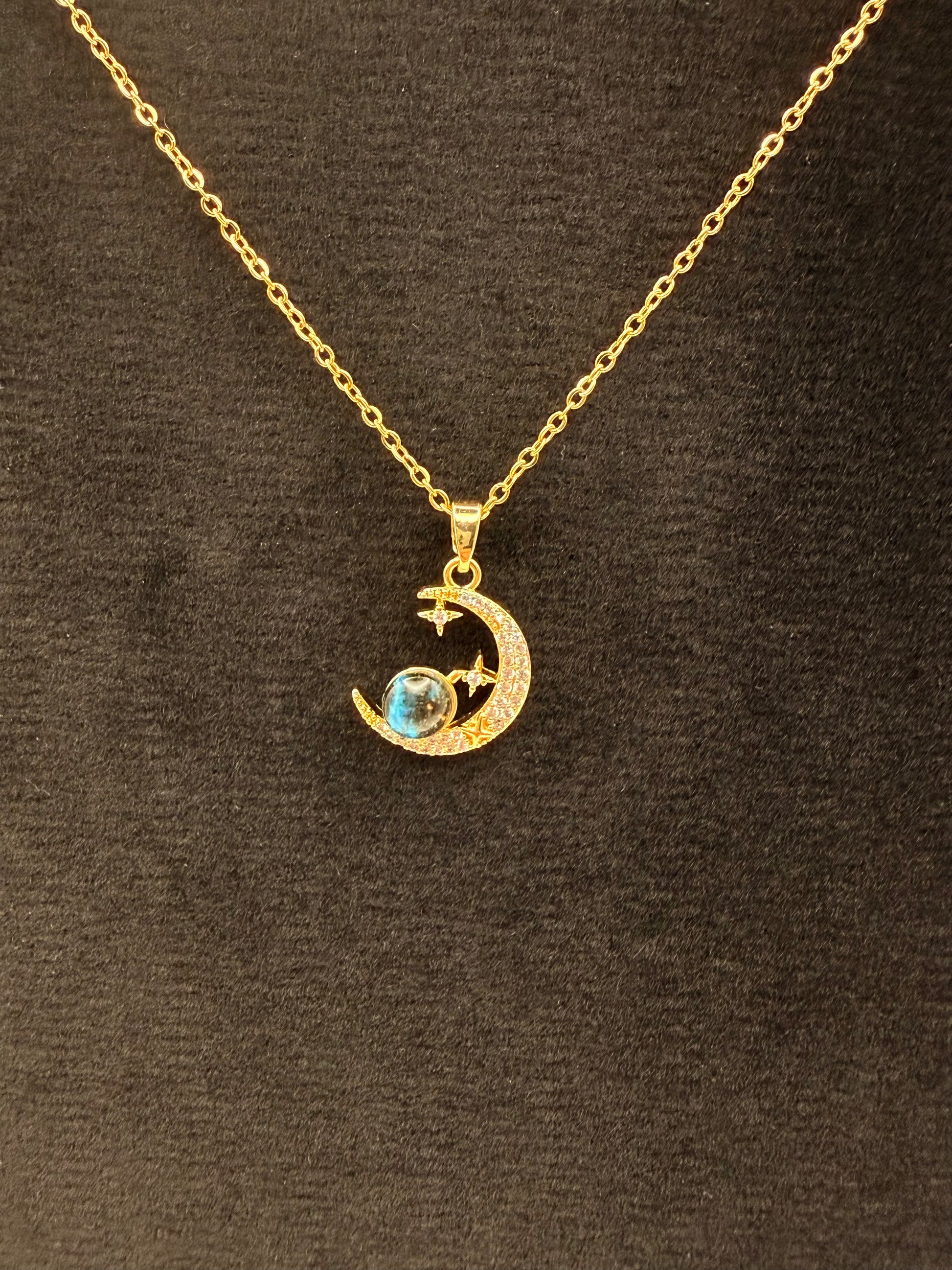 Ce collier Titan, un bijou élégant, il présente un pendentif en forme de lune orné d’une pierre bleue, symbole de sérénité et de mystère.