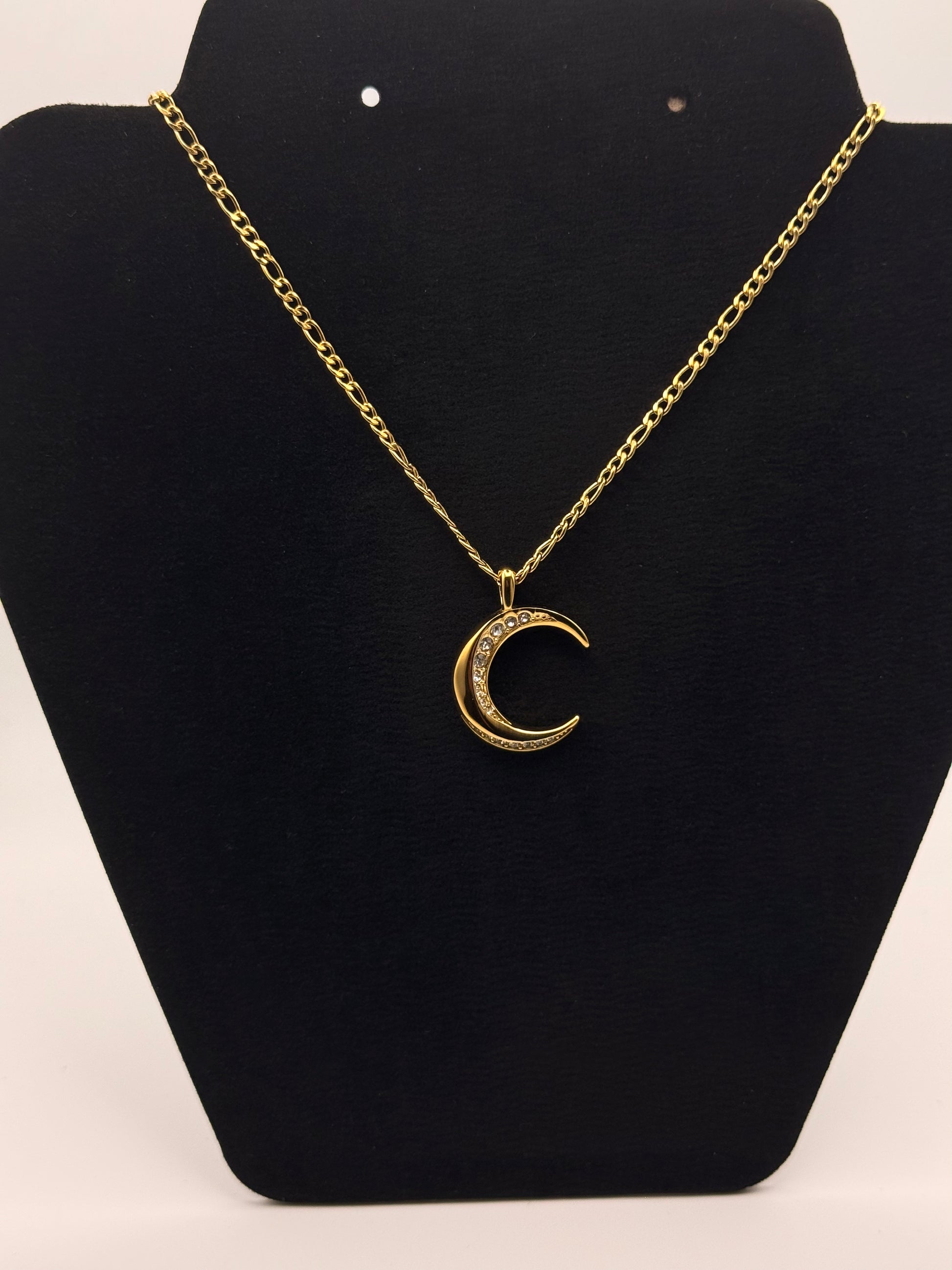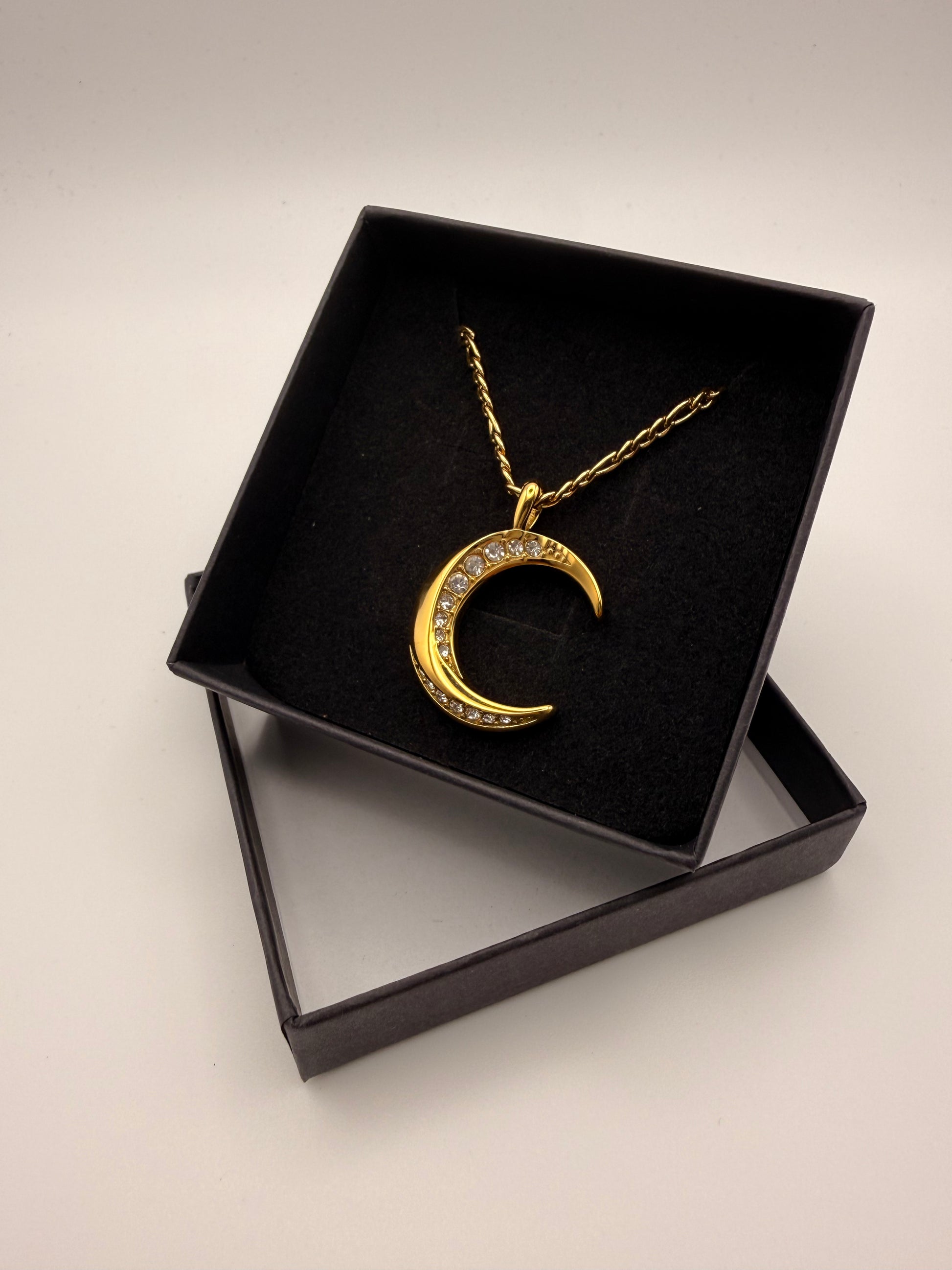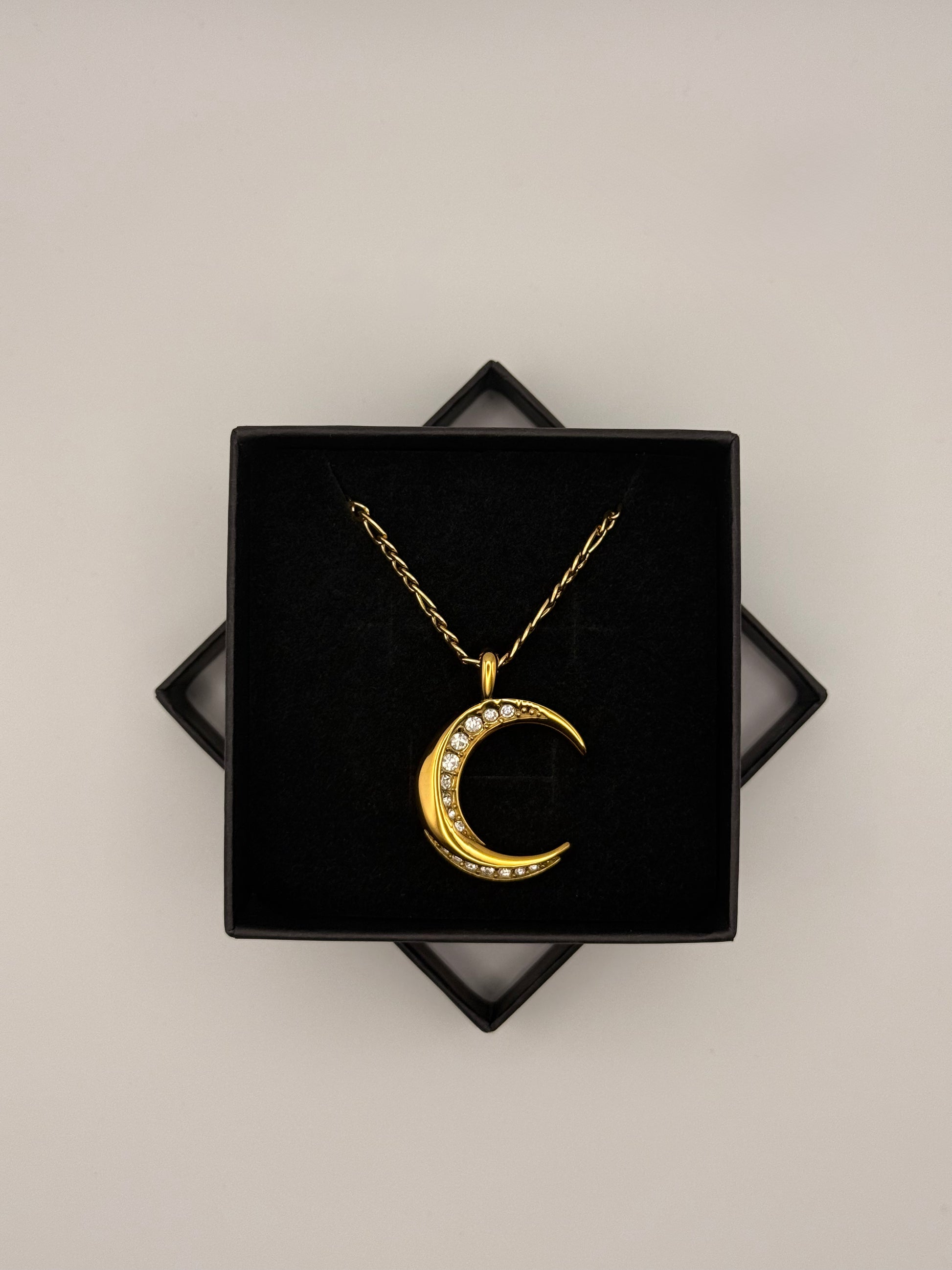 Ce collier Hyperion, incarne l'élégance subtile avec son pendentif en forme de croissant de lune délicatement orné de pierres blanches éclatantes.