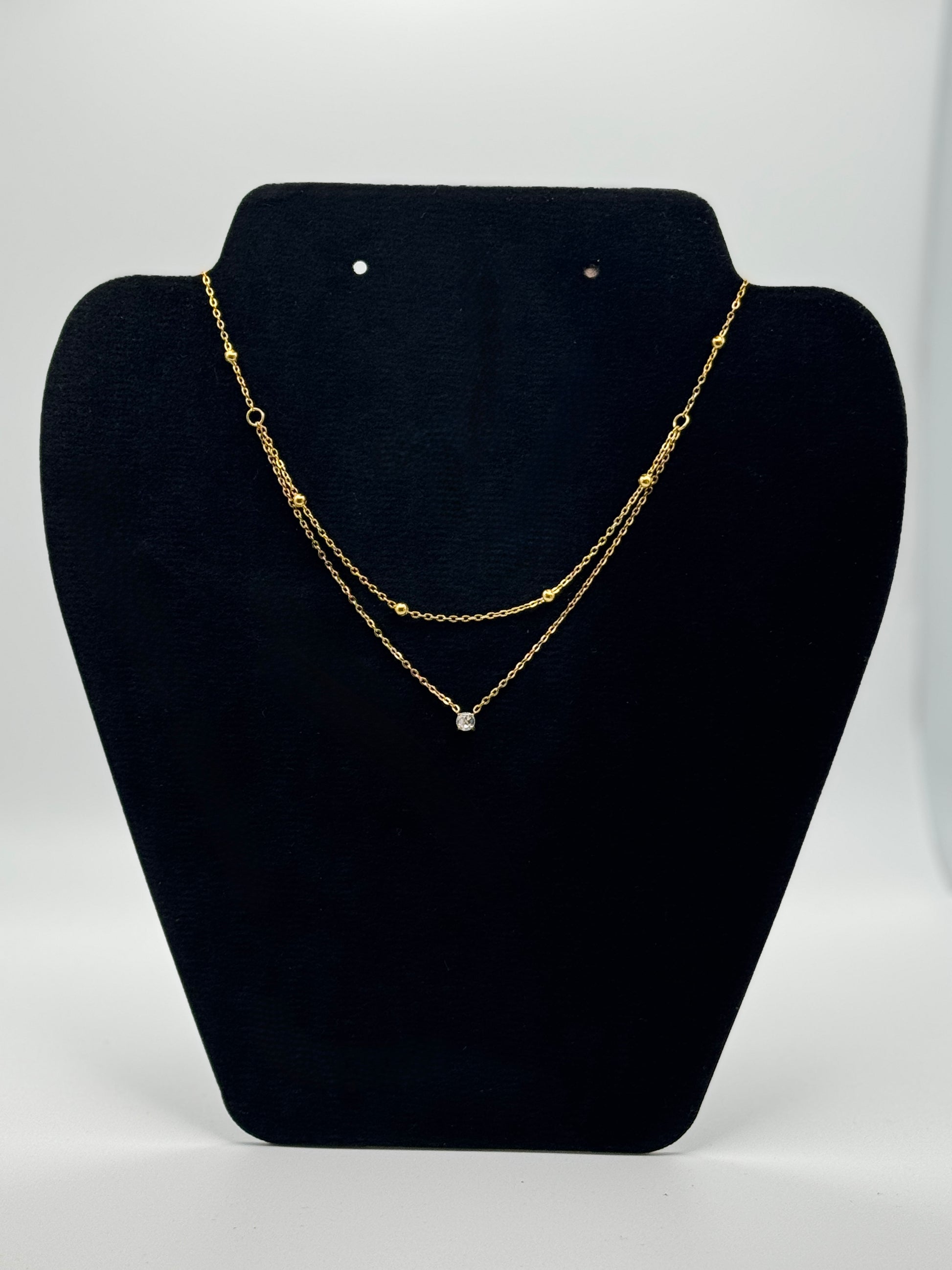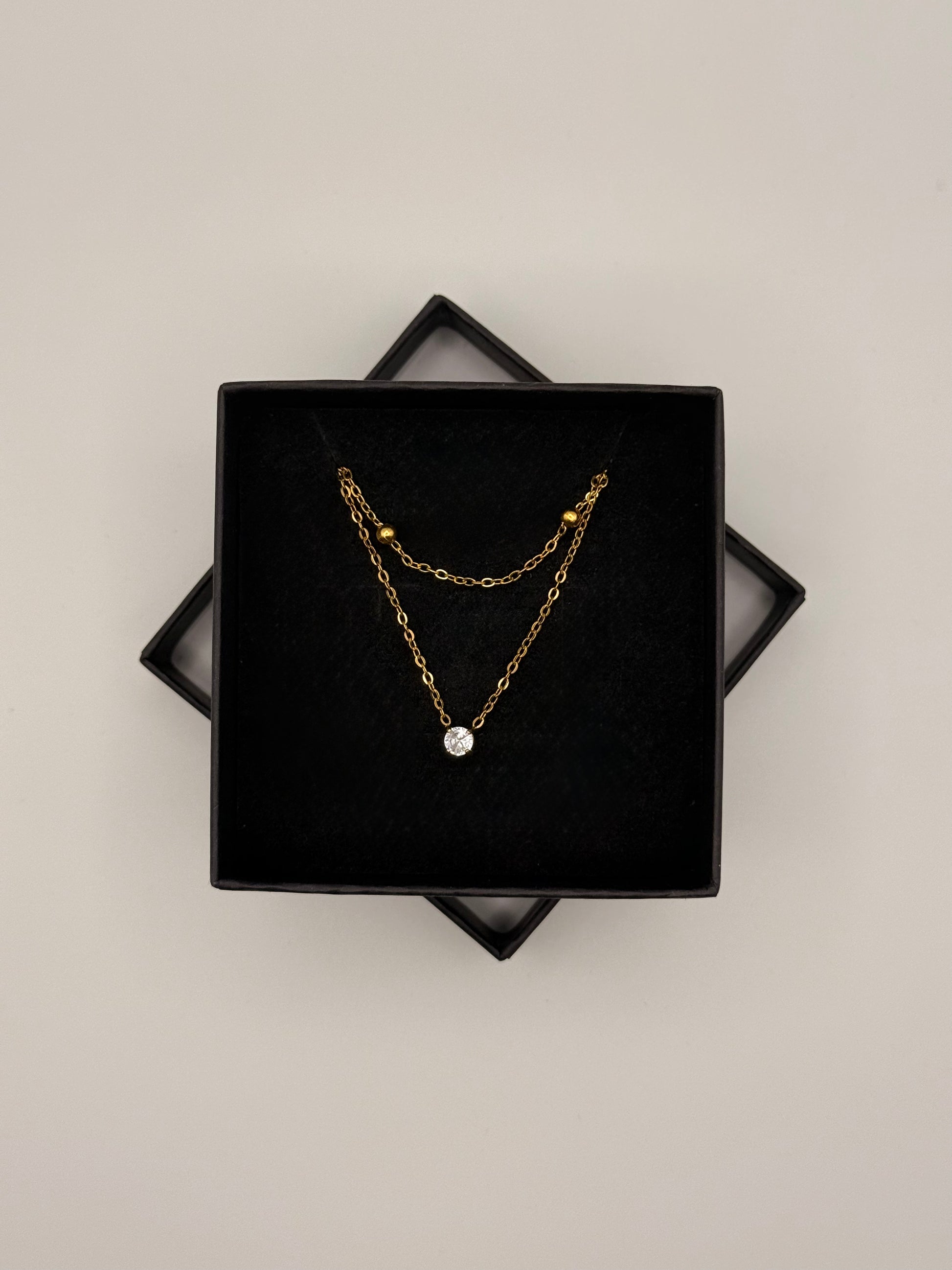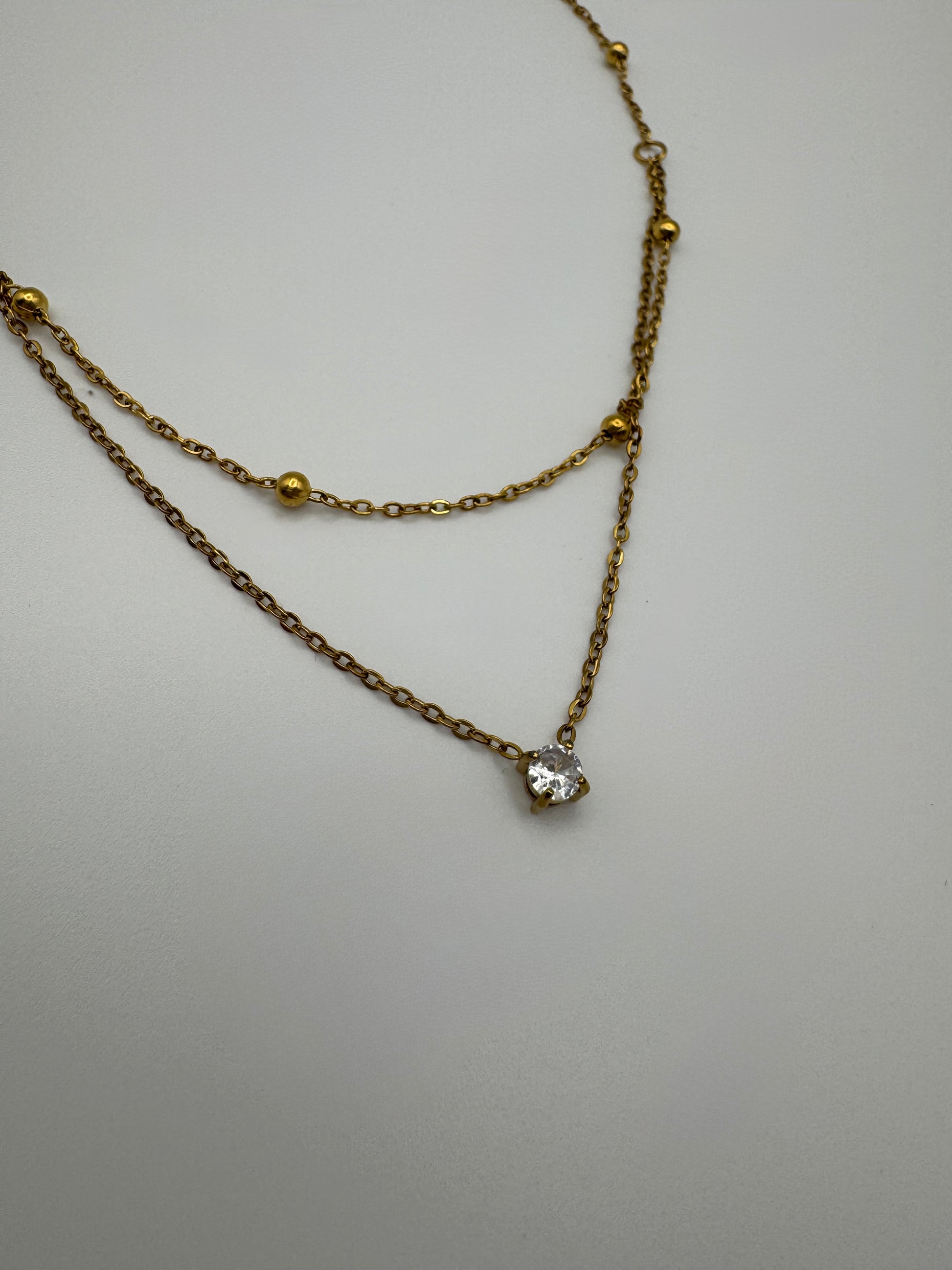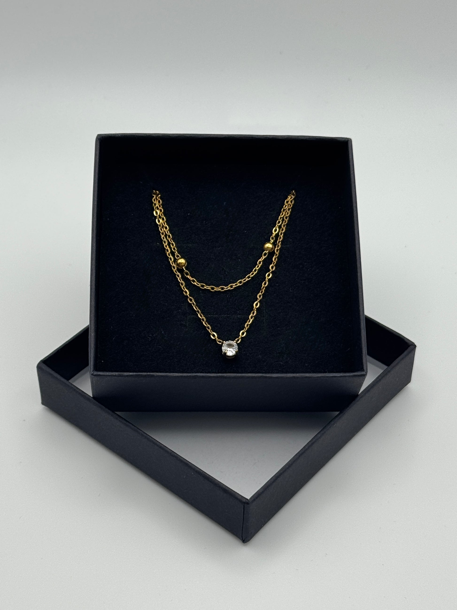 Rhéa est un collier fin et délicat composé de deux chaînes dorées en acier inoxydable plaqué or. La première chaîne est ornée de petites perles lisses pour un effet raffiné, tandis que la seconde met en valeur un pendentif scintillant, apportant une touche lumineuse et féminine.