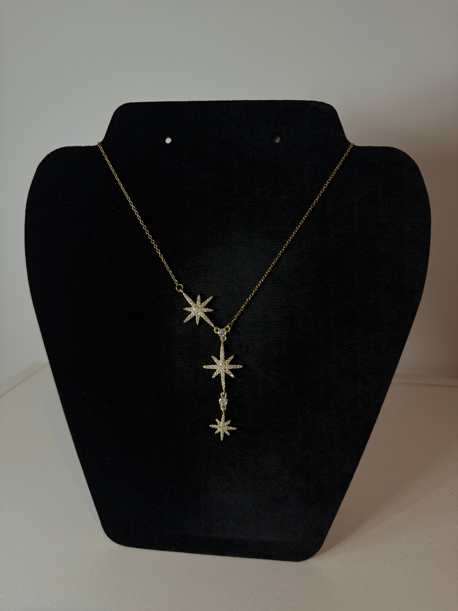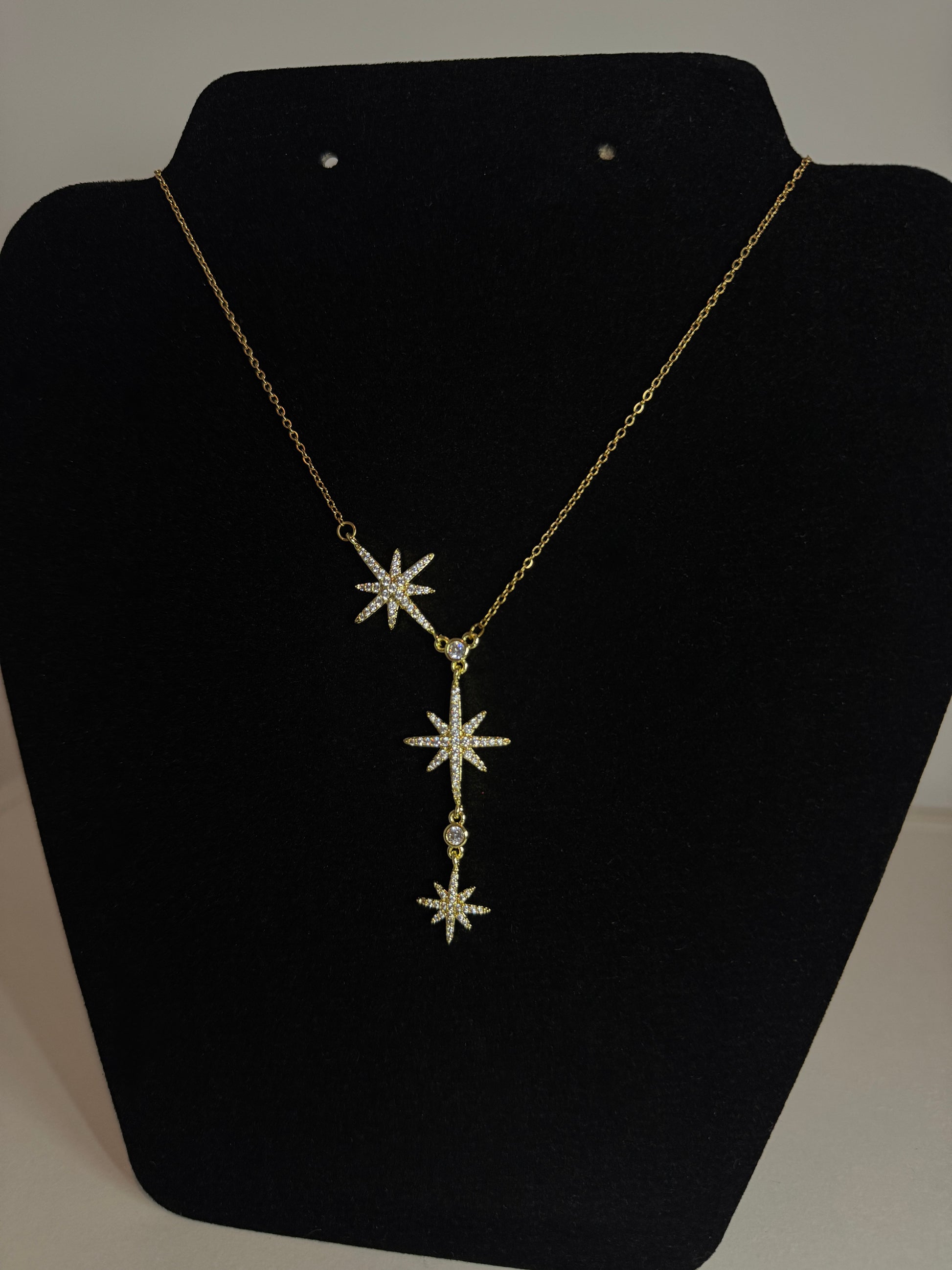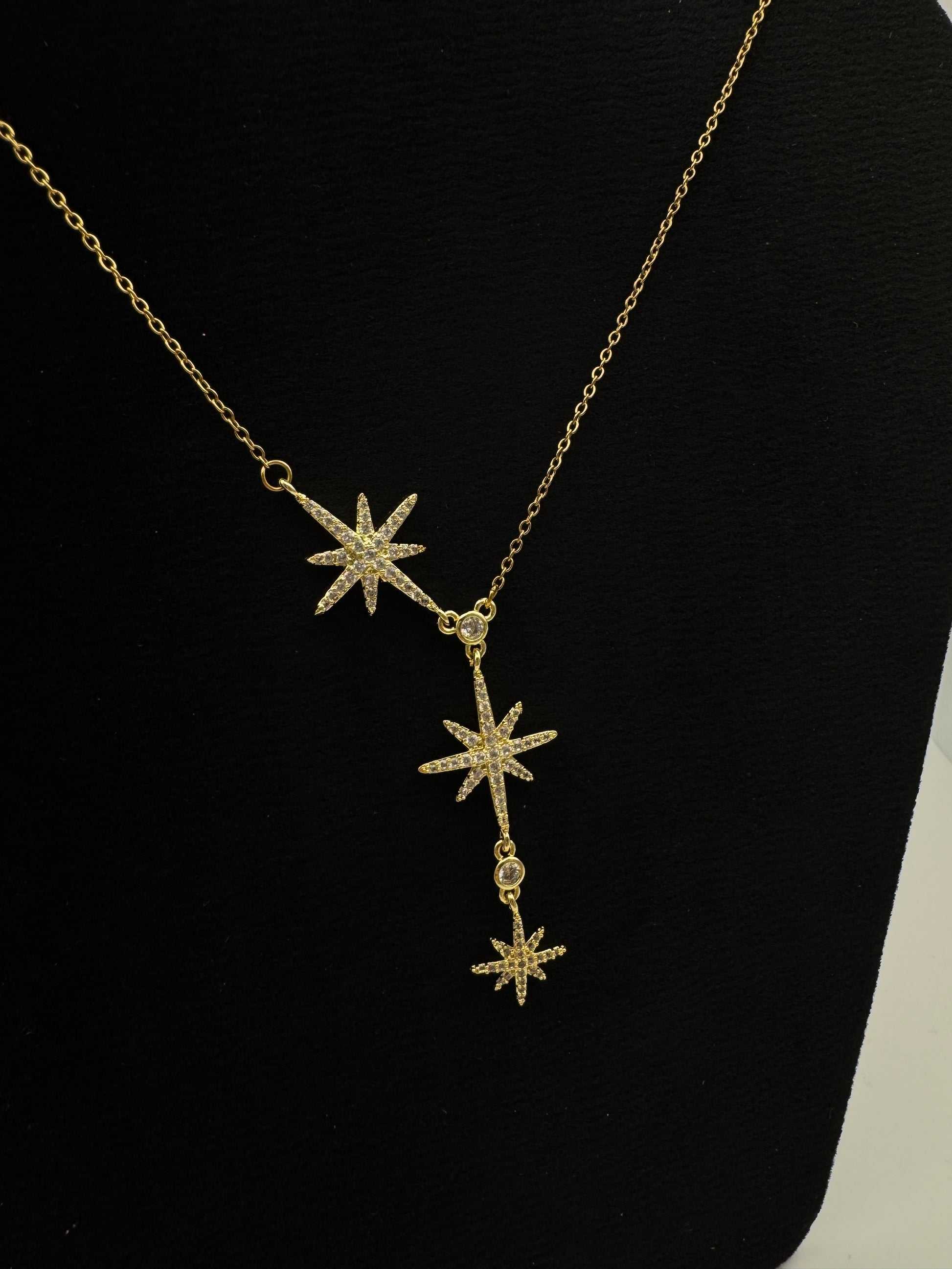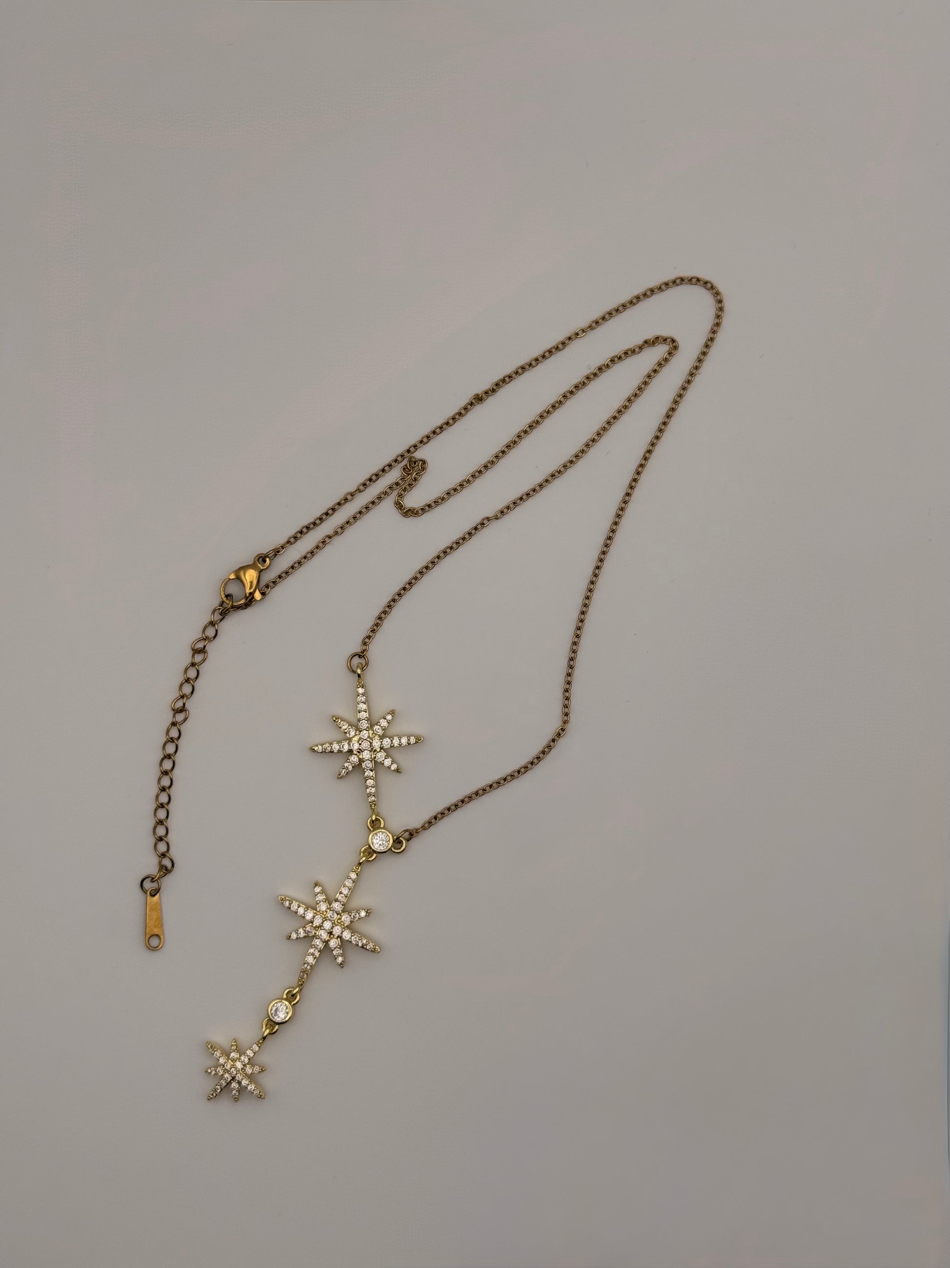 Ce collier Stellaire façonné en acier plaqué or, se distingue par ses trois étoiles alignées élégamment ornées de pierres blanches scintillantes.
