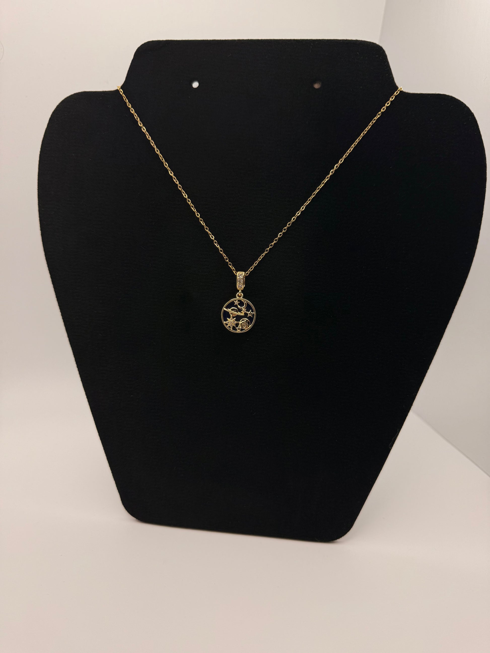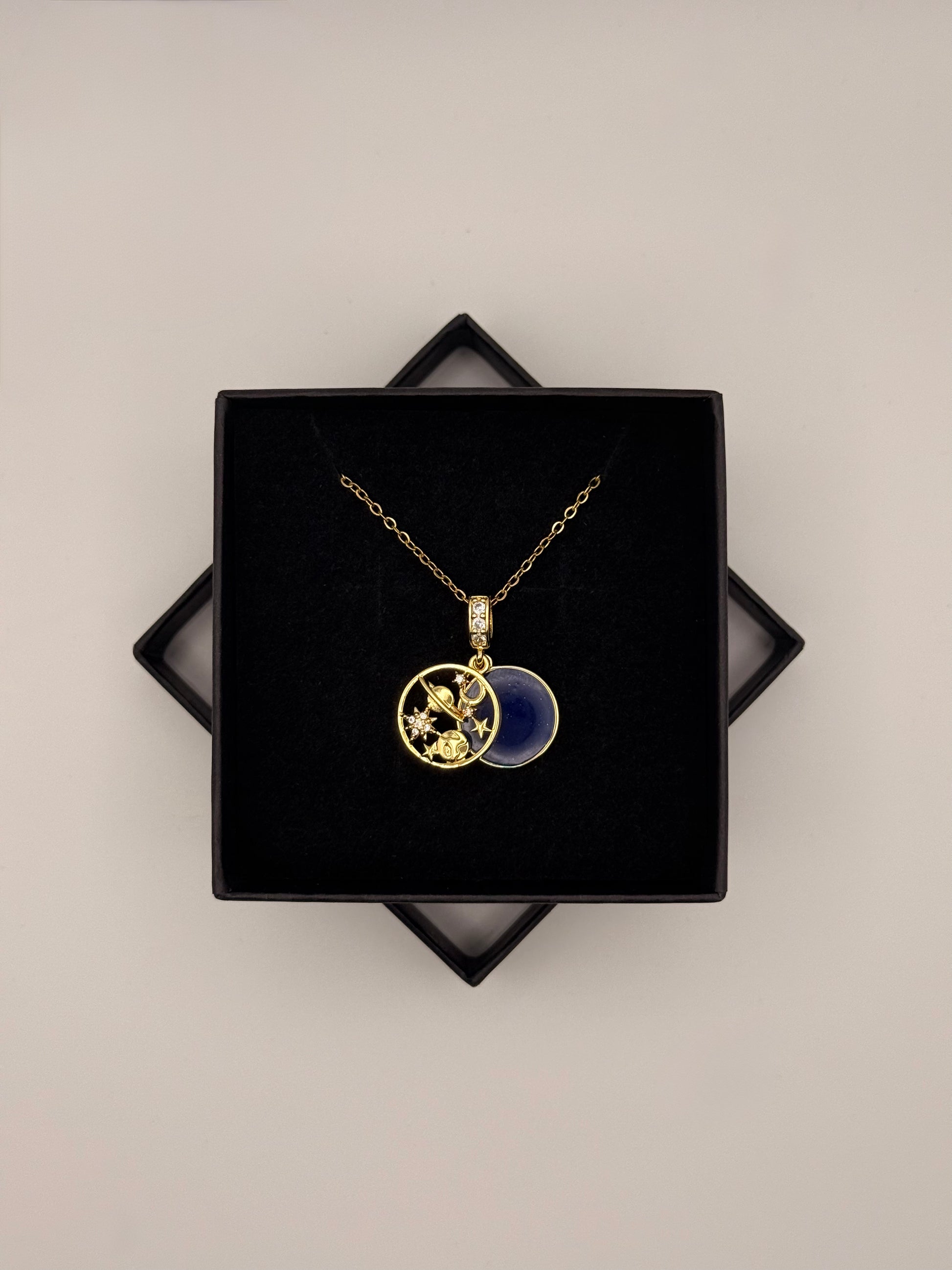 Composé de deux pendentifs distincts, il associe un motif solaire raffiné fait d’étoiles et de planètes à une pierre bleue subtile, évoquant la profondeur de l’univers.